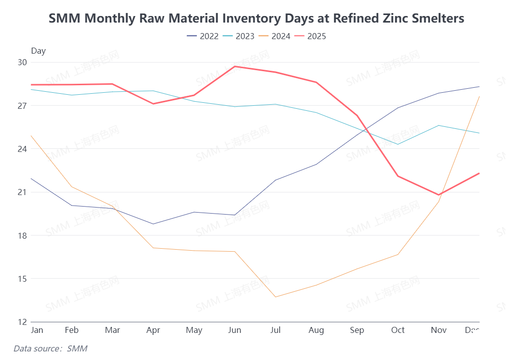 Meanwhile, TCs for domestic zinc concentrate have recently stabilized at low levels. On one hand, smelters conducted concentrated procurement of imported zinc concentrate in November and December for winter stockpiling needs. As these imported zinc concentrate arrived gradually, the days of raw material inventories at smelters have increased slightly MoM. On the other hand, considering the narrowing price spread between domestic and imported zinc concentrate and the persistently low production levels at smelters, the rush to purchase domestic zinc concentrate has somewhat subsided. However, the tight supply-demand pattern for domestic zinc concentrate has not shown significant improvement. In terms of actual trends, TCs for domestic zinc concentrate have only temporarily stopped falling recently, without a substantial rebound.