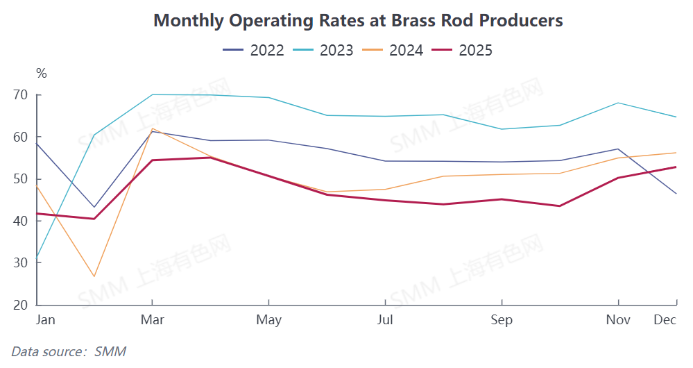 Looking ahead to January 2026, SMM expects the copper billet operating rate to pull back to 51.31%, down 1.43 percentage points MoM but up 9.62 percentage points YoY, mainly because the same period last year coincided with the Chinese New Year break, resulting in a low base. Specifically, according to feedback from brass billet producers, order intake since the start of accepting January 2026 orders from late December has fallen short of expectations. Most downstream customers plan to begin Chinese New Year holidays around late January, with weak pre-holiday stockpiling willingness. Expected order declines will directly lead to lower operating rates for brass billet in January, with some small producers even planning to start holidays early in late January. Combined with the continued suppression of demand from high copper prices, the usage proportion of alternative materials downstream may further increase, likely shrinking brass billet order volumes and raising operating pressure in the industry.