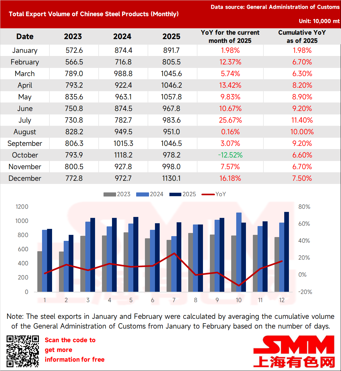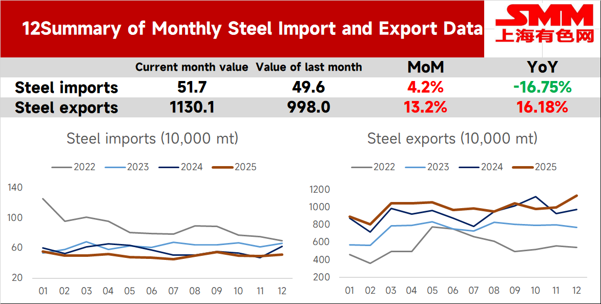 On January 14, data from the General Administration of Customs showed that China exported 11.301 million mt of steel in December 2025, an increase of 1.321 million mt from the previous month, up 13.24% MoM. From January to December, China's steel exports totaled 119.019 million mt, up 7.5% YoY.