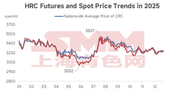 In 2025, HRC prices followed a "concave" trend, with SMM's national average spot price fluctuating between 3153-3506 yuan/mt. The annual average price was 3324.45 yuan/mt, down 8.9% YoY from 3649.38 yuan/mt in 2024. Throughout the year, HRC prices experienced high volatility in Q1, a sharp decline and bottoming out in Q2, a strong rally driven by macro tailwinds such as "anti-involution" in Q3, followed by a retreat from highs, and finally ended with rangebound fluctuations in Q4. The annual average price fluctuation range was relatively narrow, with the price center gradually shifting downward.