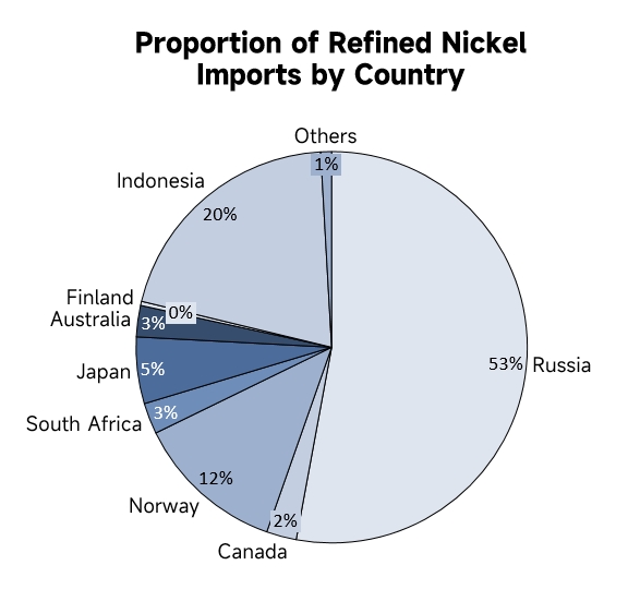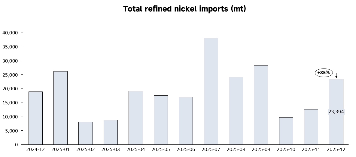 In December 2025, China's refined nickel imports reached 23,394 mt, up 85% MoM and up 24% YoY. Among them, other unwrought non-alloy nickel imports 16,177 mt, accounting for 69% of refined nickel imports.