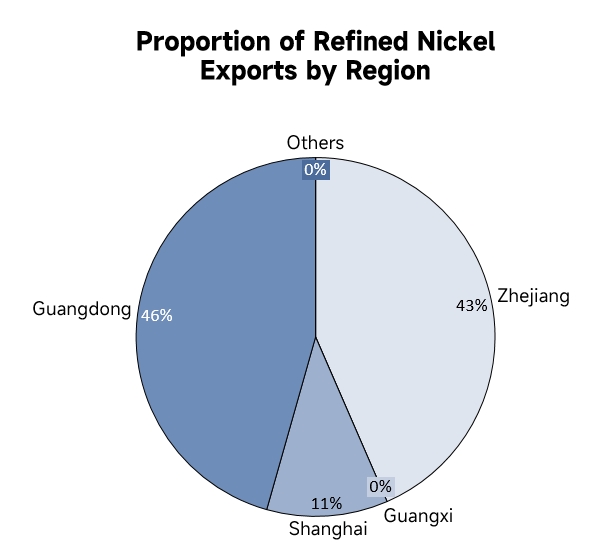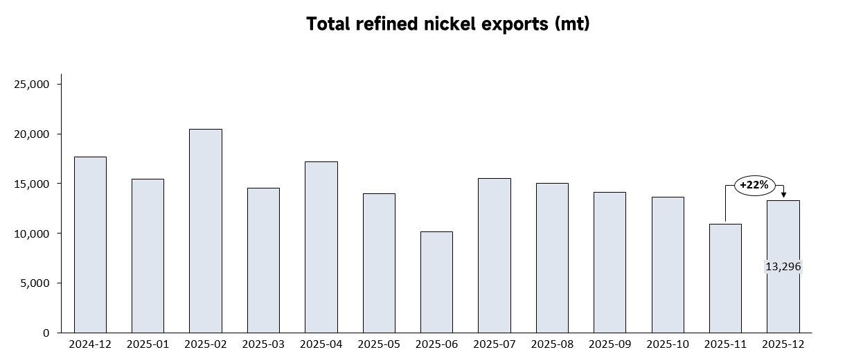 In December 2025, China's refined nickel exports 13,296 mt, up 22% MoM but down 25% YoY. Among them, other unwrought non-alloy nickel exports 11,928 mt, accounting for 90% of refined nickel exports.