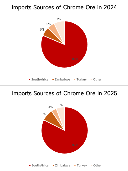 South Africa's share of chrome ore supply to China rose to 82.41%, maintaining its position as the largest supplier. Zimbabwe's supply share climbed to 8.13%, ranking second, while Turkey's share dropped to 3.59%.