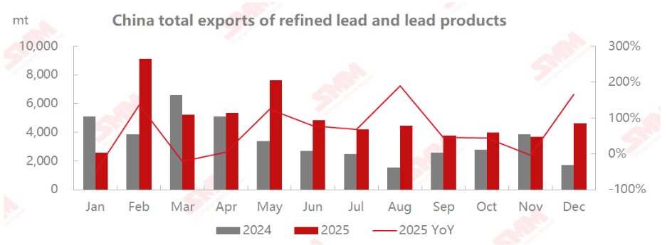 According to customs data, China's refined lead exports totaled 2,767 mt in December 2025, up 141.08% MoM and 270.61% YoY. Total exports of refined lead and lead materials from January to December reached 59,440 mt, up 42.5% YoY. On the import side, China's refined lead imports stood at 8,395 mt in December, while lead alloy imports reached 24,011 mt. Total imports of refined lead and lead materials from January to December amounted to 198,641 mt, down 10.19% YoY.