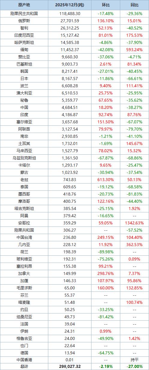 The following table details China's copper cathode import data for December 2025, based on information from the General Administration of Customs: