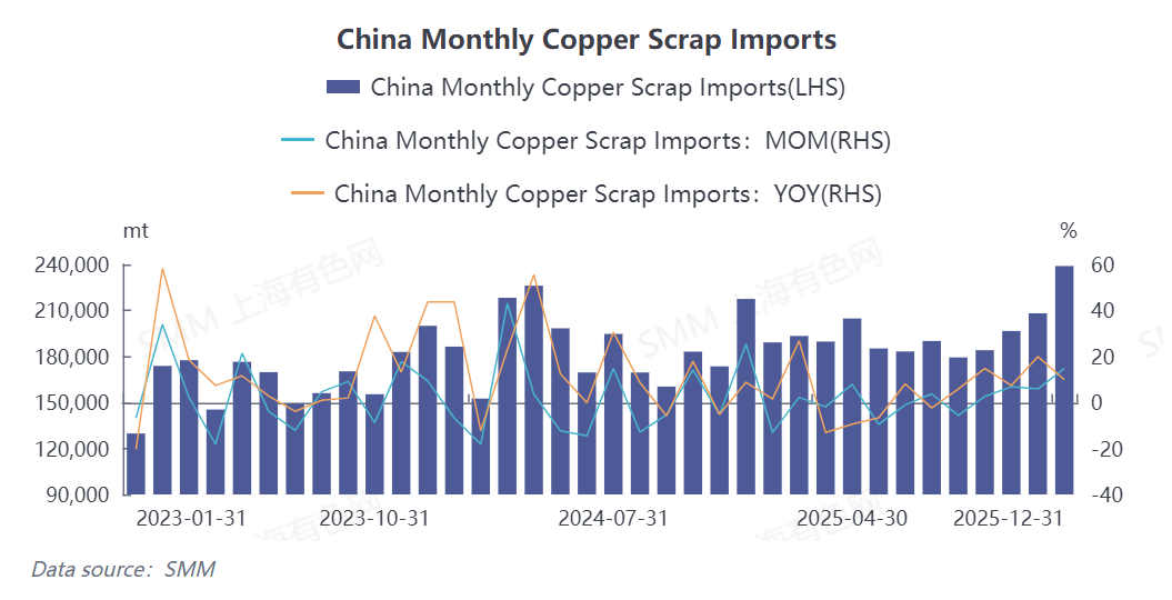 The latest data from the General Administration of Customs shows that in December 2025, China imported 239,000 mt in physical content of copper scrap and shredded copper scrap, up 14.81% MoM and 9.88% YoY. For the full year of 2025, cumulative imports reached 2.3427 million mt in physical content, up 4.12% YoY. China's secondary copper raw material imports maintained an overall stable and positive development trend amid a complex international economic and trade environment. (HS code: 74040000)