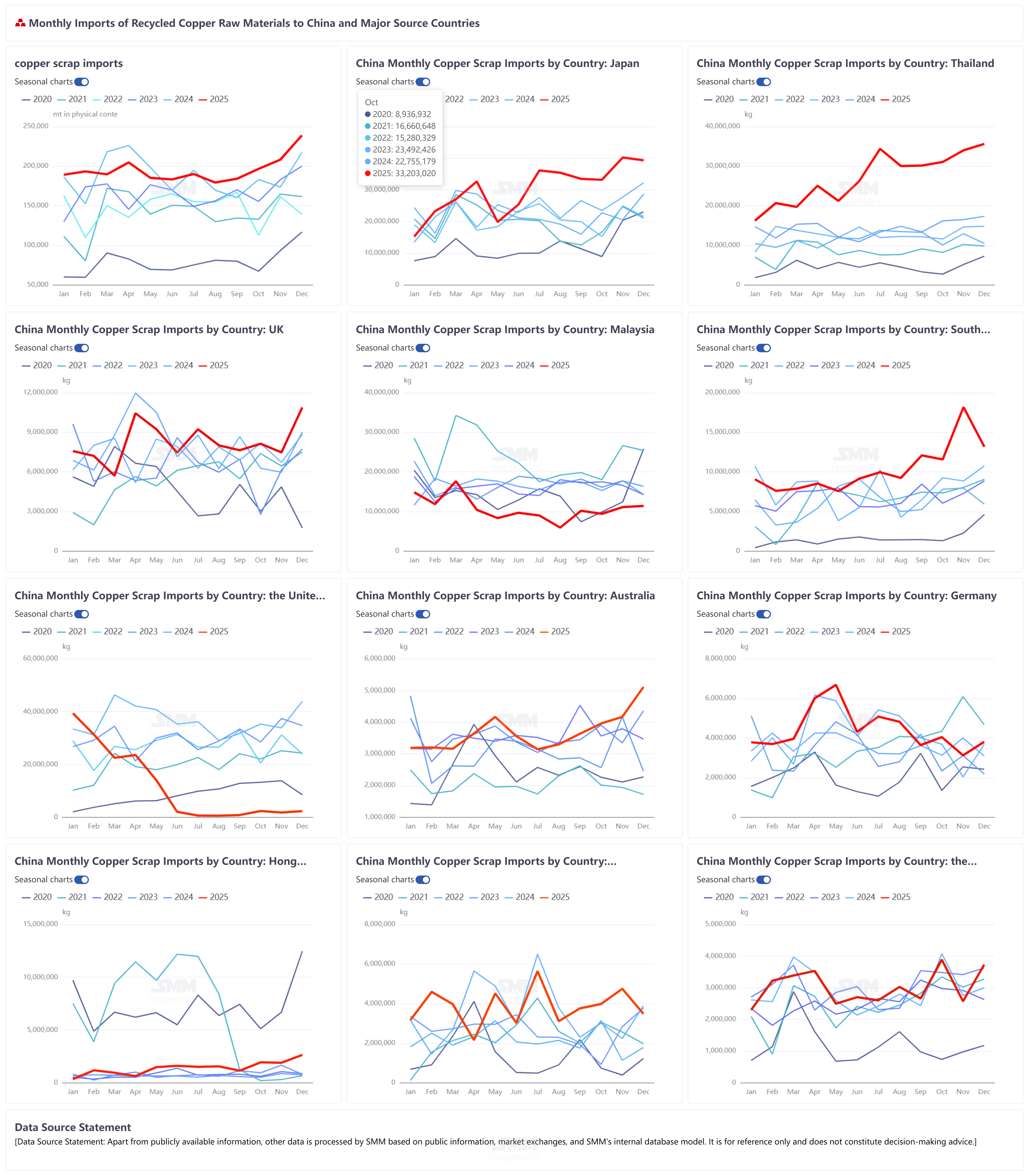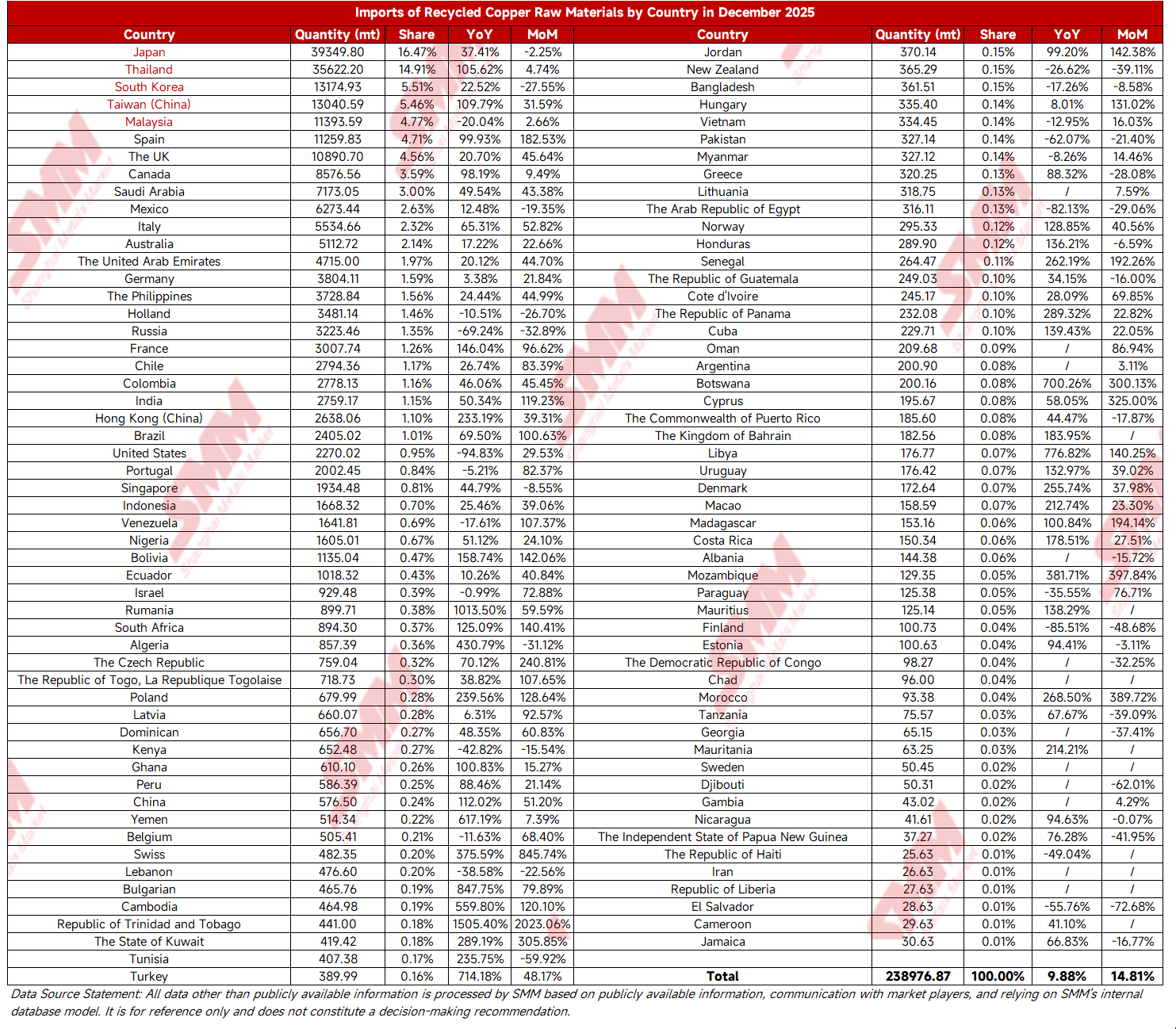 Overall, China's secondary copper raw material imports maintained growth resilience in terms of total volume in 2025, underpinned by the rigid demand for recycled metals driven by domestic green, low-carbon, circular economic development. The profound evolution of the supply structure, particularly the rapid rise in share from surrounding Asian countries (such as Thailand and Malaysia) and stable input from European sources, highlights the effectiveness of China's strategy to optimize import origins. This has reduced reliance risks from single markets and enhanced supply chain resilience and security. Driven by the "dual carbon" goals and resource recycling policies, domestic demand for secondary copper will persist in the long term. Imports are expected to remain at a certain scale, but growth rates may become more stable, with increased focus on synergistic development with the domestic recycling system. (The following appendix contains import data for secondary copper raw materials for December 2025)
