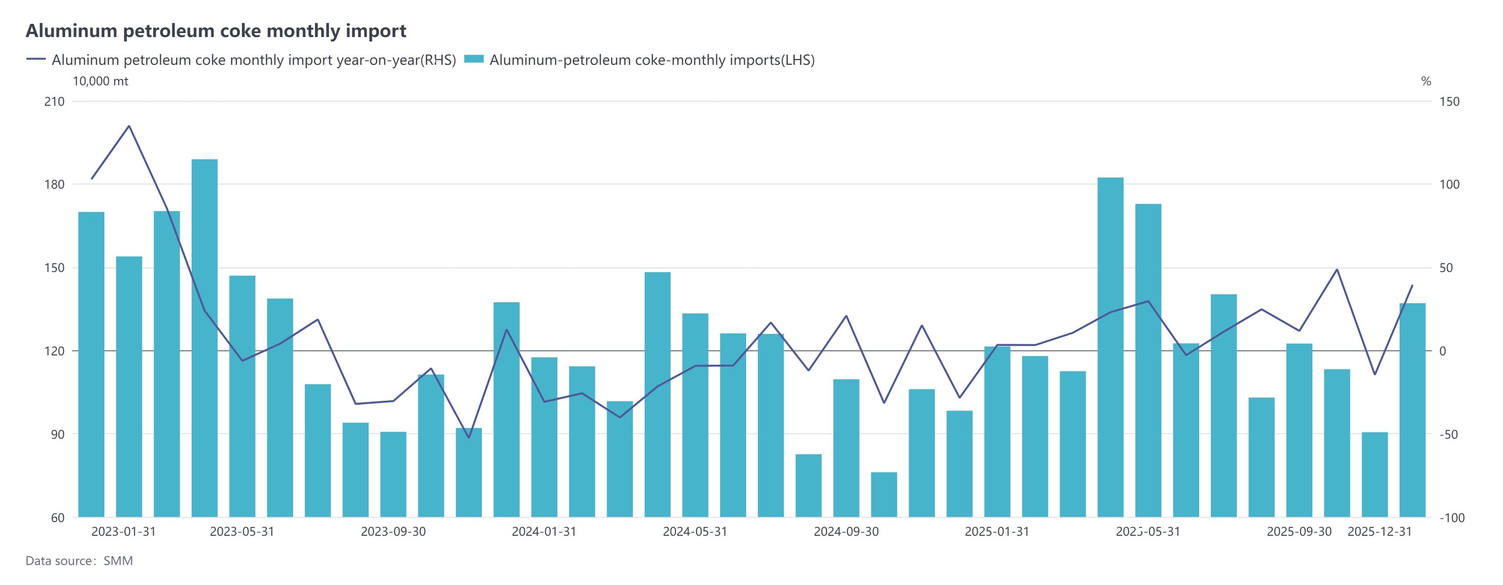 According to customs data, China's petroleum coke imports in December 2025 reached 1.3702 million mt, up 51.32% MoM and 39.41% YoY; the estimated import price for petroleum coke in December was $229.34/mt, down 1.68% MoM but up 67.60% YoY. The total cumulative imports of petroleum coke in China for 2025 were approximately 15.3618 million mt, up 14.65% YoY.