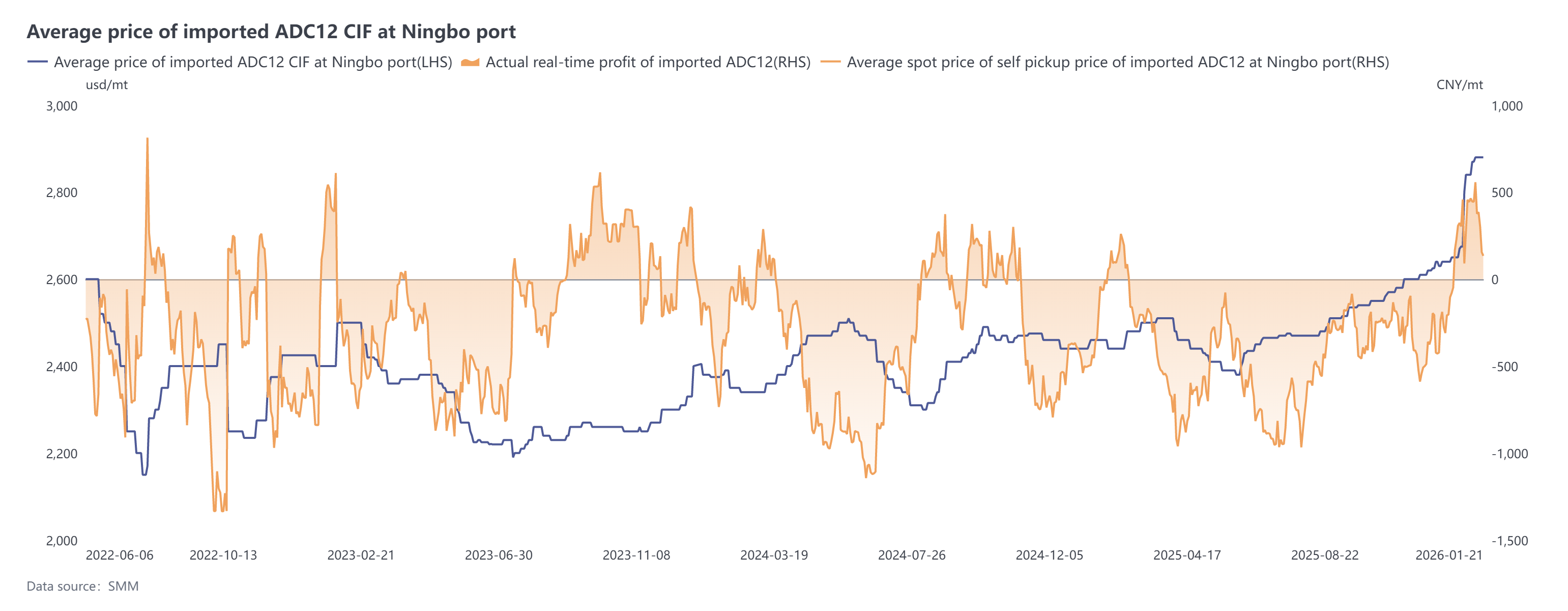 Overall, in 2025, China's unwrought aluminum alloys showed a trend of shrinking imports and growing exports. Annual imports decreased by 16.9% YoY to 1.0084 million mt; exports increased by 17.5%, reaching 284,700 mt. The weak import performance was mainly due to two factors: first, the persistent inversion of the price spread between domestic and overseas aluminum alloys throughout the year, weakening the import advantage and closing the profit window; second, the tight supply of aluminum scrap or recovering demand in Japan, South Korea, and India, which pushed up regional alloy ingot prices, leading to a significant reduction in resources flowing into China. From late December 2025 to January 2026, domestic ADC12 prices rose sharply in line with aluminum prices, reaching their highest level since October 2021. Although overseas prices also climbed rapidly to above $2,850/mt, the increase was smaller than that in the domestic market. The immediate import profit/loss shifted from a deficit to above the break-even point, theoretically reopening the import window. Imports in January 2026 were projected to range between 80,000–100,000 mt.