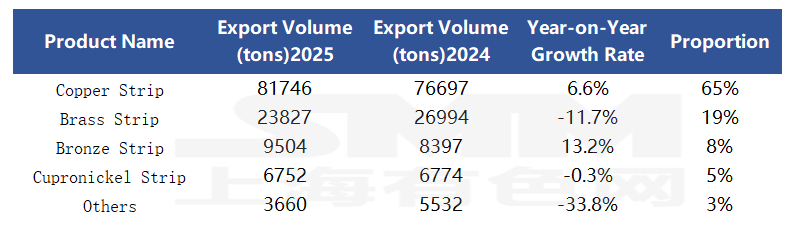 From the breakdown of product structure, China's copper plate/sheet and strip exports in 2025 were still dominated by copper strip, with exports reaching 81,700 mt, accounting for 65% of total exports, and achieving a 6.6% increase YoY, making it the core category boosting exports; bronze strip performed remarkably, with exports up 13.2% YoY, showing strong growth momentum; however, affected by factors such as export policy adjustments and intense homogeneous competition, brass strip exports in 2025 showed a declining trend, down 11.7% YoY. In addition, other categories of plate/sheet and strip saw a decline as high as 33.8%, reflecting the continued import dependence of China's high-end copper plate/sheet and strip products.