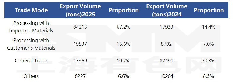 The export tax rebate policy for copper plate/sheet and strip was officially canceled from December 1, 2024, which had an immediate impact on the industry's export structure. A comparison of annual data shows that before the policy adjustment, Ordinary Trade was the primary export method, accounting for 70.3% in 2024. After the policy took effect, enterprises quickly shifted to bonded trade methods such as Processing Trade with Imported Materials and Processing Trade with Supplied Materials, with their combined proportion surging to 82.8% in 2025, a sharp increase of 61.4 percentage points from 21.4% in 2024. Among them, exports under Processing Trade with Imported Materials surged from 17,900 mt to 84,200 mt, and its share soared from 14.4% to 67.2%, becoming the core strategy for enterprises to cope with the cancellation of the tax rebate. This directly reflects the adaptive optimization of trade structures by enterprises in response to the policy adjustment.