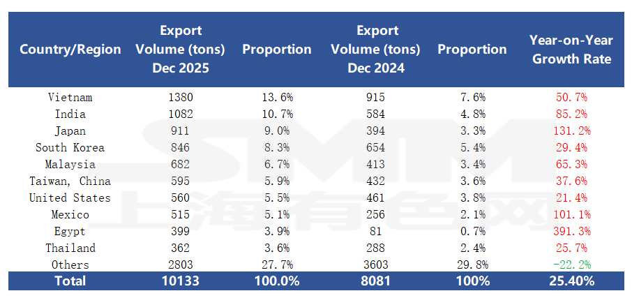 In December, China's copper plate/sheet and strip exports performed impressively, reaching 92 countries and regions, with major export destinations all achieving YoY growth in exports. In terms of rankings, the top-tier landscape shifted: Vietnam retained the top position with exports of 1,380 mt; the Indian market continued its steady momentum, with a YoY growth rate of 85.2%, rising to second place; Japan, with a substantial YoY increase of 131.2%, successfully climbed to third place. From a growth perspective, besides Japan, Egypt and Mexico also stood out, with YoY growth rates reaching 391% and 101% respectively, becoming highlights of copper plate/sheet and strip exports for the month.