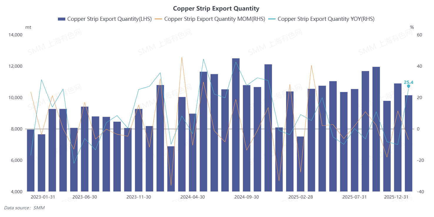 According to data from the General Administration of Customs, China's exports of copper plate/sheet and strip totaled 10,133.46 mt in December 2025, down 6.92% MoM but up 25.4% YoY. From January to December, cumulative exports of copper plate/sheet and strip reached 125,489.3 mt, with a cumulative increase of 0.88% YoY.