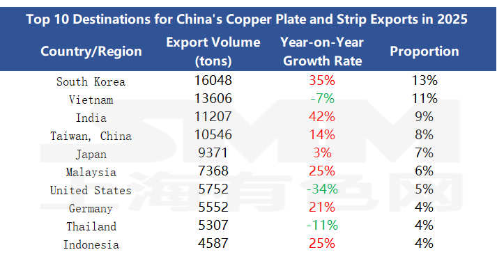 From a full-year perspective, China's total exports of copper plate/sheet and strip reached 125,500 mt in 2025, up 0.88% YoY, characterized by overall stable volume and structural divergence. Export market concentration remained high, with the top ten countries and regions collectively contributing over 70% of exports, forming the core foundation. Among them, South Korea ranked first with exports of 16,000 mt, up 35% YoY; India followed closely, with exports surging 42% YoY, becoming a key driver of growth; markets such as Malaysia, Germany, and Indonesia also achieved steady growth in the range of 21%–25%. Some traditional markets experienced significant adjustments: exports to the US fell sharply by 34% YoY, Thailand dropped 11% YoY, and Vietnam also saw a slight pullback of 7%, reflecting the impact of localized demand changes and overseas tariff adjustments on the market.