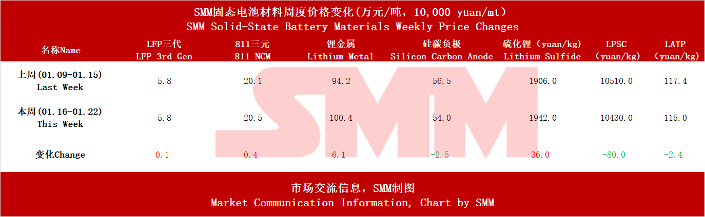 Preface: Weekly price situation, prices for traditional lithium battery materials used in solid-state batteries increased to varying degrees due to the rise in lithium chemicals prices, while silicon carbon anode prices declined. The price of lithium sulfide, a dedicated material for solid-state batteries, rose steadily due to robust demand. Prices for sulphide and oxide electrolytes decreased.