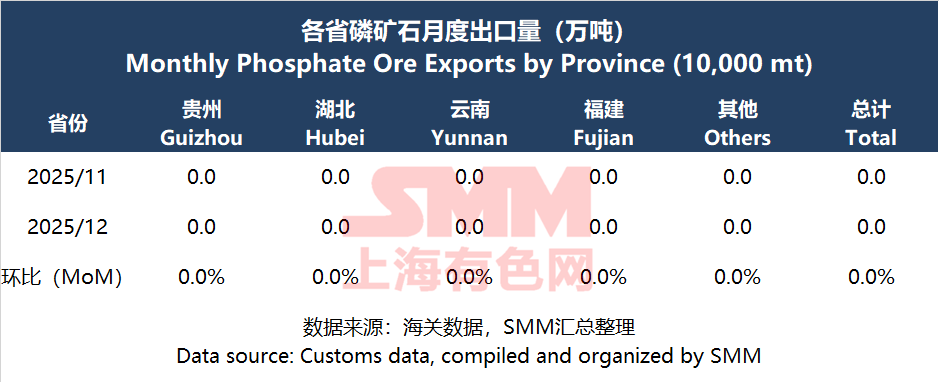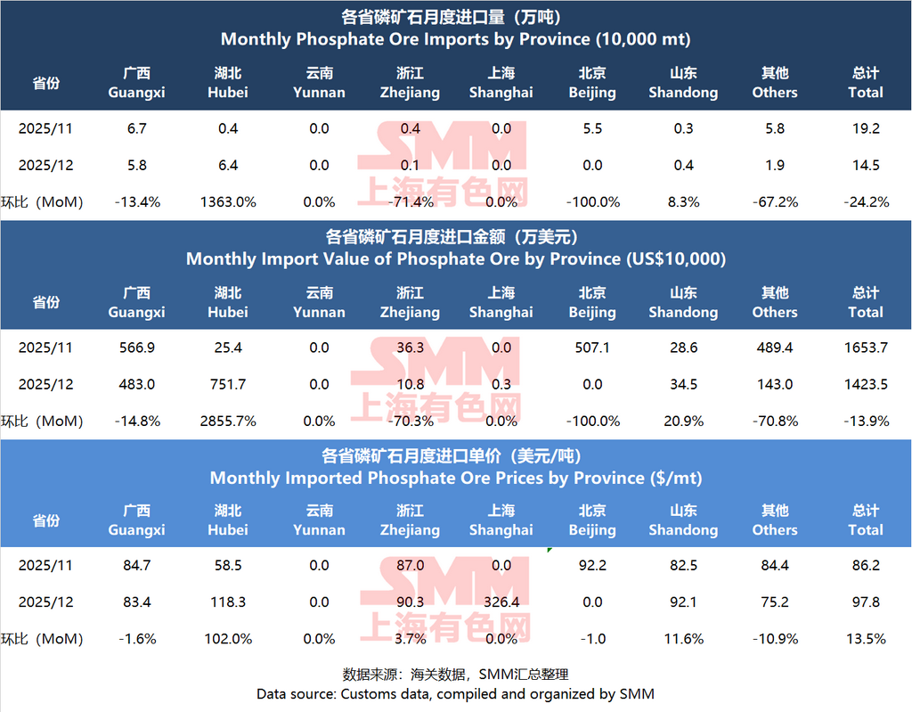 Highlights: In December 2025, China's total phosphate ore imports decreased 24.2% MoM to 145,000 mt, and the total import value decreased 13.9% MoM. The comprehensive national import average price increased 13.5% MoM. The rise in average price was mainly due to a phosphate chemical enterprise in Hubei importing 60,000 mt of high-priced phosphate ore from Peru at a unit price of $121/mt.