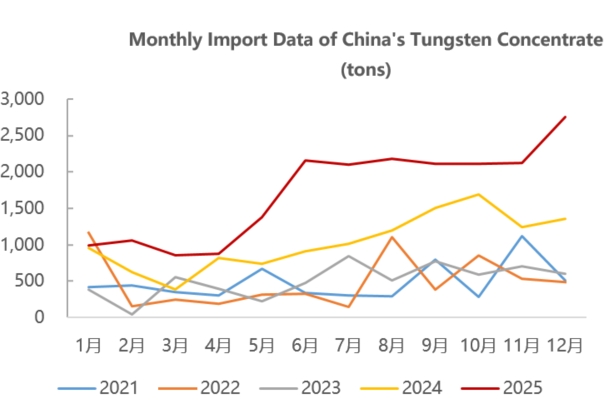 The total annual import volume of tungsten products hit 23,210.9 tons (in physical quantity) in 2025, surging 39.5% year-on-year; the import volume in December reached 2,907.3 tons, a significant month-on-month growth of 29.5% and a year-on-year increase of 58.1%, showing that the procurement intensity rose markedly at the end of the year.
