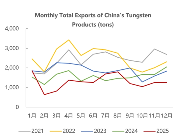 Monthly export data throughout 2025 shows that after the release of China's tungsten-related product export control policies in February 2025, the export volume of controlled products such as sodium paratungstate and tungsten carbide dropped significantly. According to customs statistics, the total annual export volume of ammonium paratungstate, tungsten powder and tungsten carbide powder products in 2025 was around 3,877 tons, down about 41.7% year-on-year.