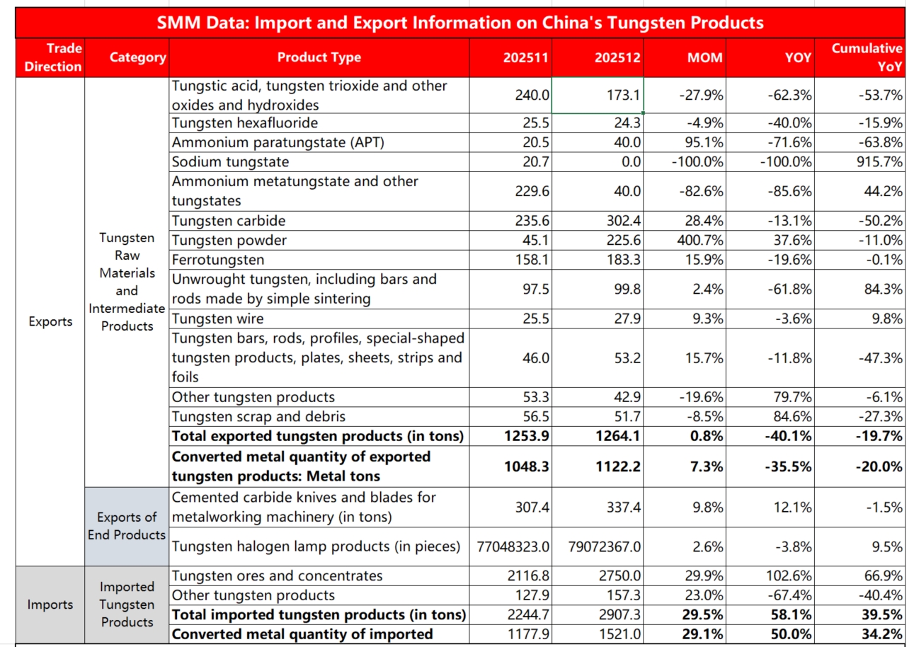 The total annual export volume of tungsten products reached 15,514.7 tons (in physical quantity) in 2025, down 19.7% year-on-year; converted to metal quantity, it stood at 13,095.7 tons, down 20.0% year-on-year. The export volume in December alone was 1,264.1 tons, a slight month-on-month increase of 0.8%, but still a sharp year-on-year decrease of 40.1%, indicating that the weak annual trend remained unchanged.