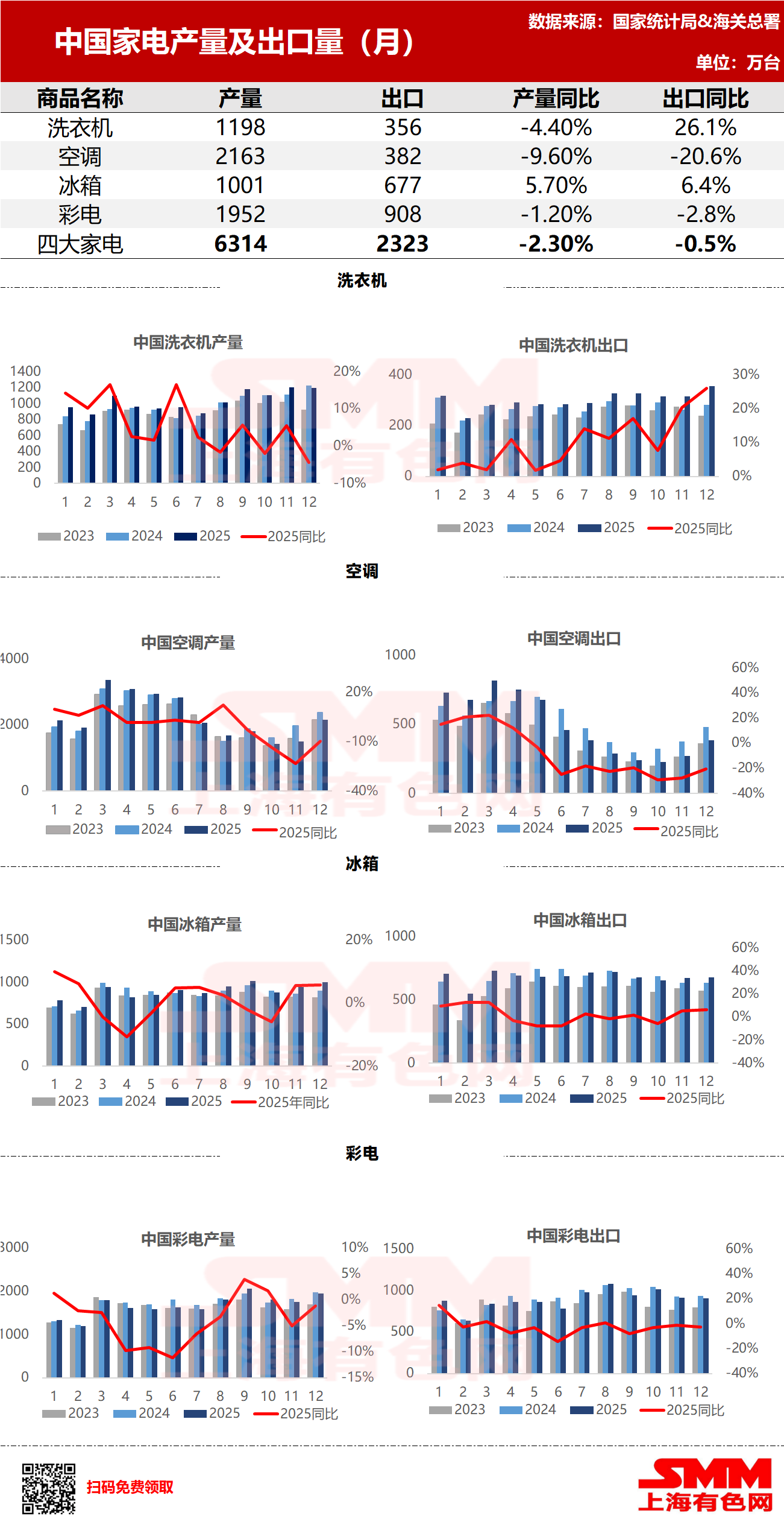 Refrigerator exports in December were 6.77 million units, up 6.4% YoY; cumulative exports from January to December were 81.65 million units, up 1.7% YoY.