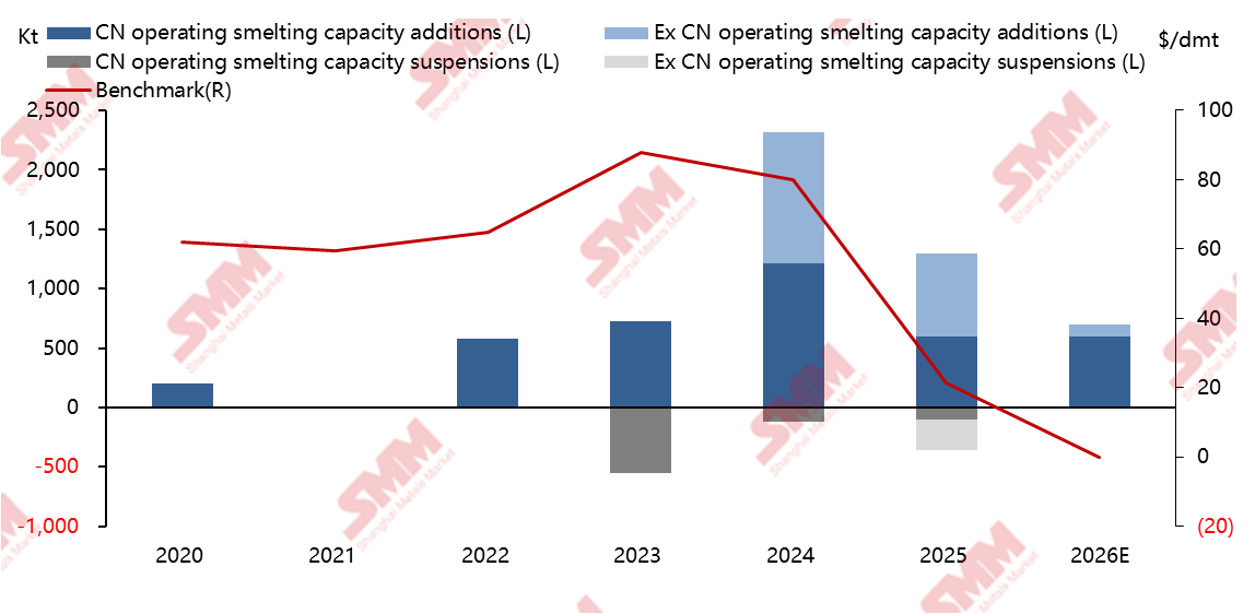 The long-term benchmark pricing system for cu cons is facing significant pressure. Except for Antofagasta, long-term contract negotiations with other major suppliers are becoming increasingly fragmented. Currently, the annual benchmark is still based on the agreement reached between Antofagasta and Chinese smelters, but its market influence is gradually weakening. This stems from two factors: the tightening supply of cu cons, prompting more suppliers to pursue higher profits by departing from the benchmark system and adopting individualized pricing; and Antofagasta's annual direct sales of cu cons to China amounting to only about 300,000 dmt, diminishing its representativeness and bargaining power accordingly. According to SMM research, current supplier offers to domestic smelters take various forms: first, fixed TC/RC long-term contracts, mostly within the range of -50 to -60 USD/dmt; second, contracts referencing a third-party index average price with a deduction of 10-15 USD/dmt; third, a gradual shift towards spot sales, with some suppliers explicitly stating they will not sign new long-term contracts starting in 2026; fourth, contracts directly discounting the benchmark by 15%-20% or deducting 10-20 USD/dmt. Notably, the proportion of long-term contracts settled using indexed pricing and spot transactions has risen significantly, a trend actively promoted by major suppliers for their own benefit. Furthermore, recent foreign media reported that Japanese smelters reached a 2026 long-term price of 25 USD/dmt with raw material suppliers. However, SMM understands this price is merely a symbolic agreement between Japan's PPC and its affiliate, Caserones Minera Canada Limited, which holds a 49% stake in Lundin Mining's Caserones copper mine. The contracted volume is less than 50,000 dmt, offering limited market reference value and cannot be compared to the benchmark results achieved by Chinese smelters through centralized negotiations.