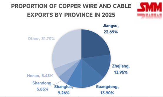 From the perspective of export provinces, China's copper wire and cable exports in 2025 covered 31 provinces, with Jiangsu ranking first at 31.14 kt, followed by Zhejiang (20.11 kt) and Guangdong (20.03 kt). The combined share of these three provinces in total national exports declined YoY.