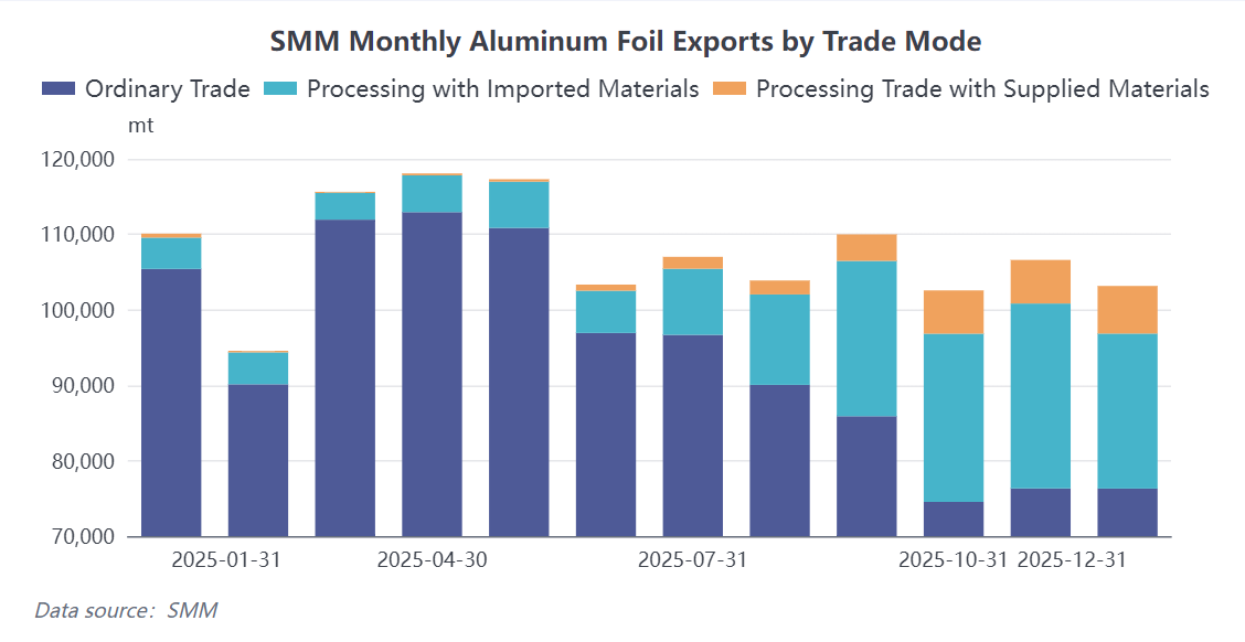 By trade mode, aluminum foil exports via Processing Trade with Imported Materials amounted to about 20,500 mt in December 2025, accounting for 18.5% of the total, while exports via Processing Trade with Supplied Materials reached 6,300 mt, representing 5.6%. For full-year 2025, aluminum plate/sheet and strip exports via Processing Trade with Supplied Materials and Processing Trade with Imported Materials were 20,500 mt and 137,200 mt, respectively, together accounting for 12.25% of total exports.