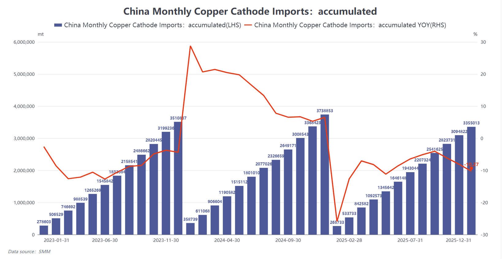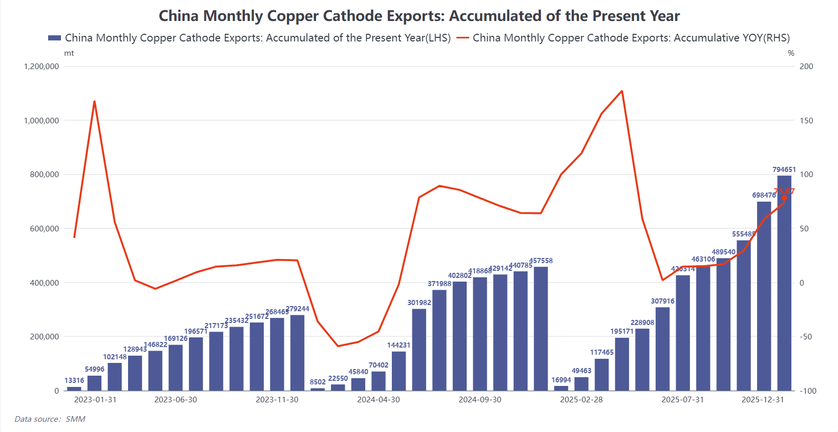 In 2025, China’s refined copper market underwent a notable shift in its trade structure, with net imports falling to the lowest level in nearly three years. According to customs data, China imported 3.35 million metric tons of refined copper in 2025, marking a year-on-year decrease of 10.27%, while exports surged to 790,000 metric tons, up 73.67% from the previous year.