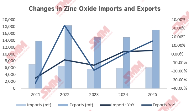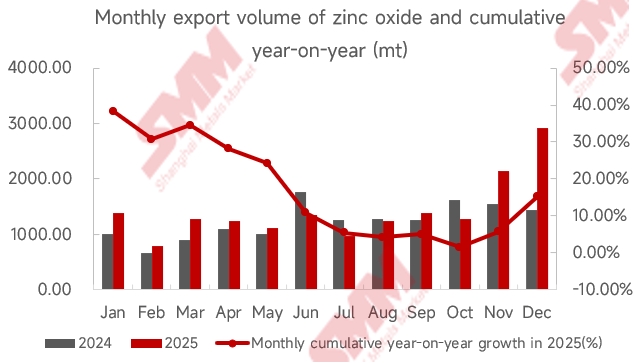 According to the latest customs data, in December 2025, China's zinc oxide imports reached 788.67 mt, up 132.09% MoM and 113.96% YoY; exports for the same month were 2,925.06 mt, up 36.54% MoM and 102.46% YoY.