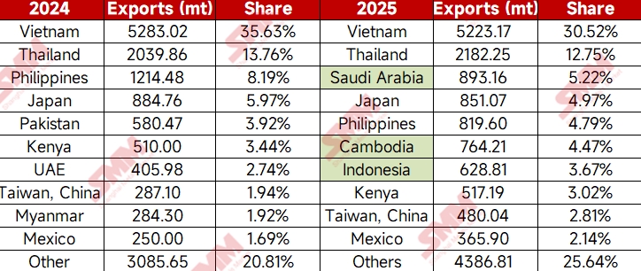 In recent years, China has consistently maintained a net export position for zinc oxide. As in 2024, Vietnam remained the top export destination for China's zinc oxide in 2025, with exports of 5,223.17 mt, accounting for 30.52% of total exports. Thailand followed, importing 2,182.25 mt of zinc oxide from China for the full year, accounting for 12.75%. The third-ranked export destination changed from the Philippines in 2024 (1,214.48 mt, 8.19%) to Saudi Arabia in 2025, with exports of 893.16 mt, accounting for 5.22%.