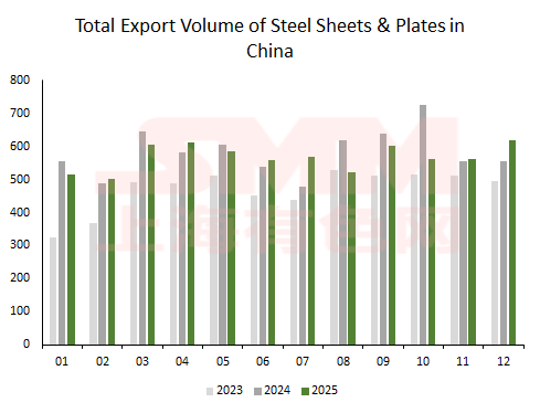 From a percentage perspective, China's steel sheets & plates exports accounted for approximately 51% of total steel exports (including steel billet) in 2025, down about 9% year-on-year compared to the same period in 2024; while exports of rebar, coiled rebar, and steel billet accounted for about 25% of total steel exports (including steel billet) this year, up approximately 9% year-on-year compared to the same period in 2024.