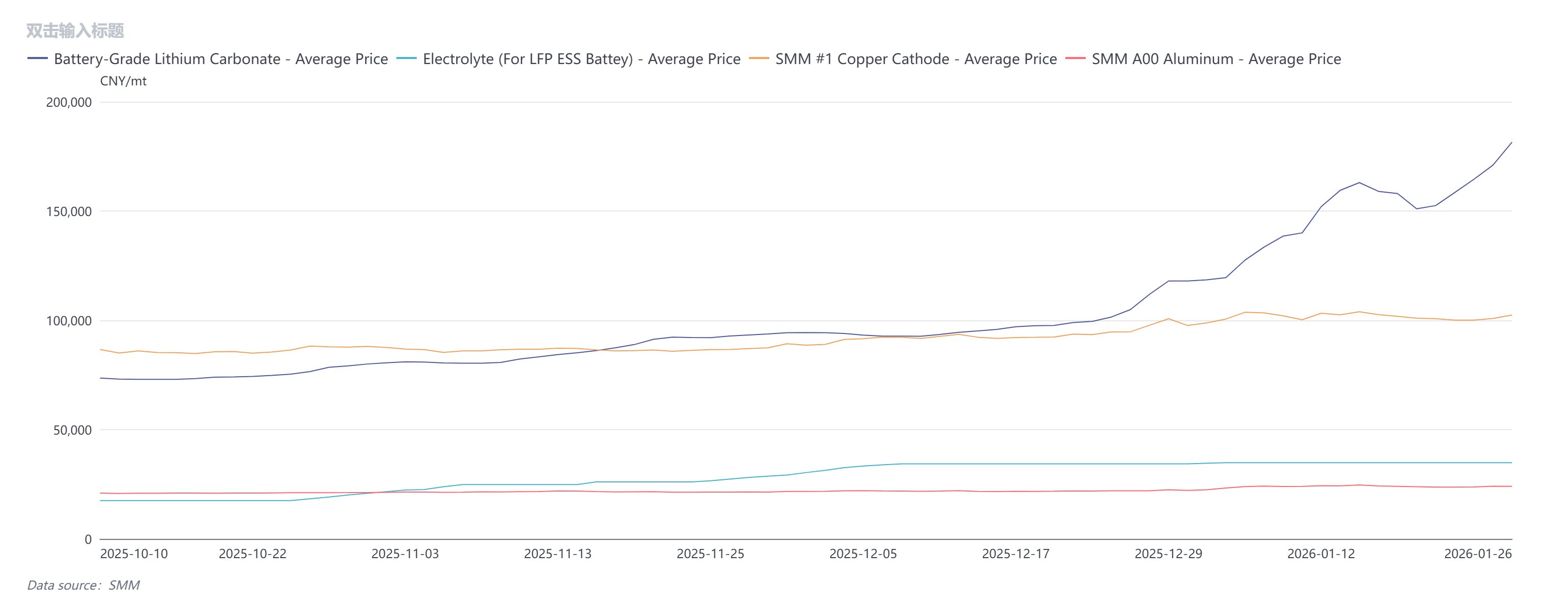 Reviewing the market performance from October 10, 2025, to January 26, 2026, the four key raw materials for ESS battery cells—cathode source (lithium carbonate), electrolyte, anode current collector (copper), and cathode current collector (aluminum)—all showed a unilateral upward trend. Among them, lithium chemicals and electrolyte exhibited explosive increases.