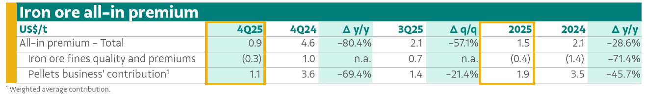 Focusing on the fourth quarter, the iron ore business demonstrated robust supply resilience, with quarterly production recorded at 90.4 Mt, a year-on-year increase of 5.1 Mt (+6%). This increment is primarily attributed to the exceptional performance of the Brucutu complex, alongside the smooth progression of capacity ramp-ups at the Capanema project and the Vargem Grande 1 (VGR1) plant.