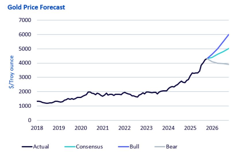 | Gold price forecast (US$/oz) | 4,600 | 5,000 | $5,500 | 5,995 |