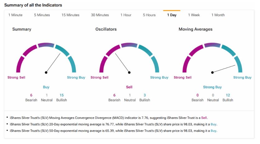 Using TipRanks’ technical analysis tool, the indicators seem to point to a positive outlook for silver. Indeed, the summary section pictured below shows that 15 indicators are Bullish, compared to one Neutral and six Bearish indicators.