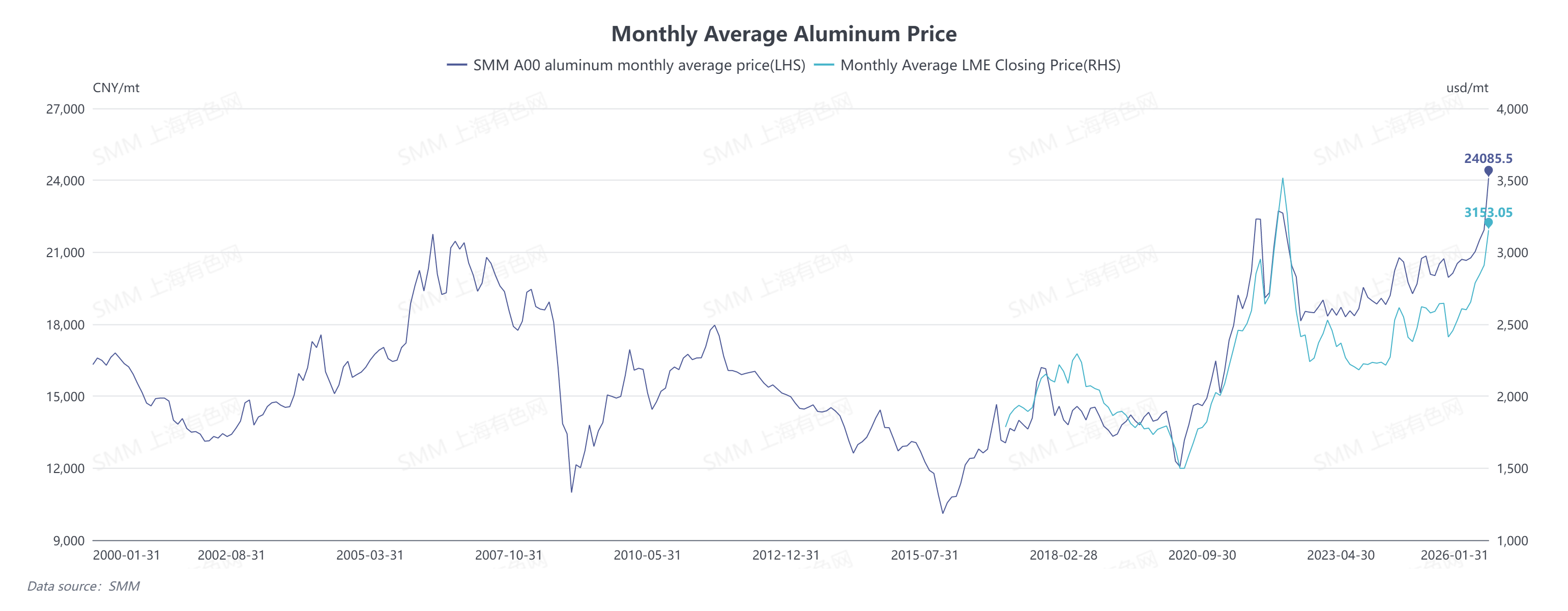 Starting in December 2024, capital inflows pushed SHFE aluminum prices to record highs. On January 30, 2026, the most-traded SHFE aluminum contract reached a highest price of 26,185 yuan/mt. In January 2026, the average SMM A00 aluminum ingot price recorded 24,085 yuan/mt, also hitting a historical peak.