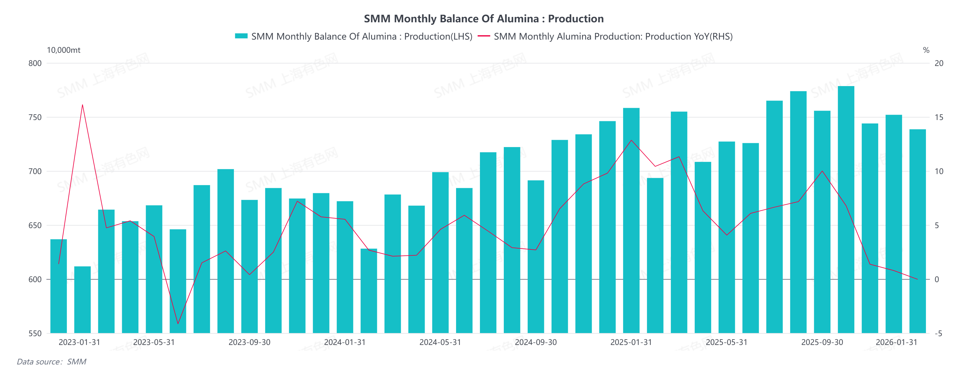 China's metallurgical-grade alumina production in January 2026 decreased by 1.78% month-on-month and 2.6% year-on-year. As of the end of January, the national built capacity was approximately 110.32 million tons, with operating capacity down 1.78% month-on-month and 3.56% year-on-year, indicating a slight contraction in overall industry production.