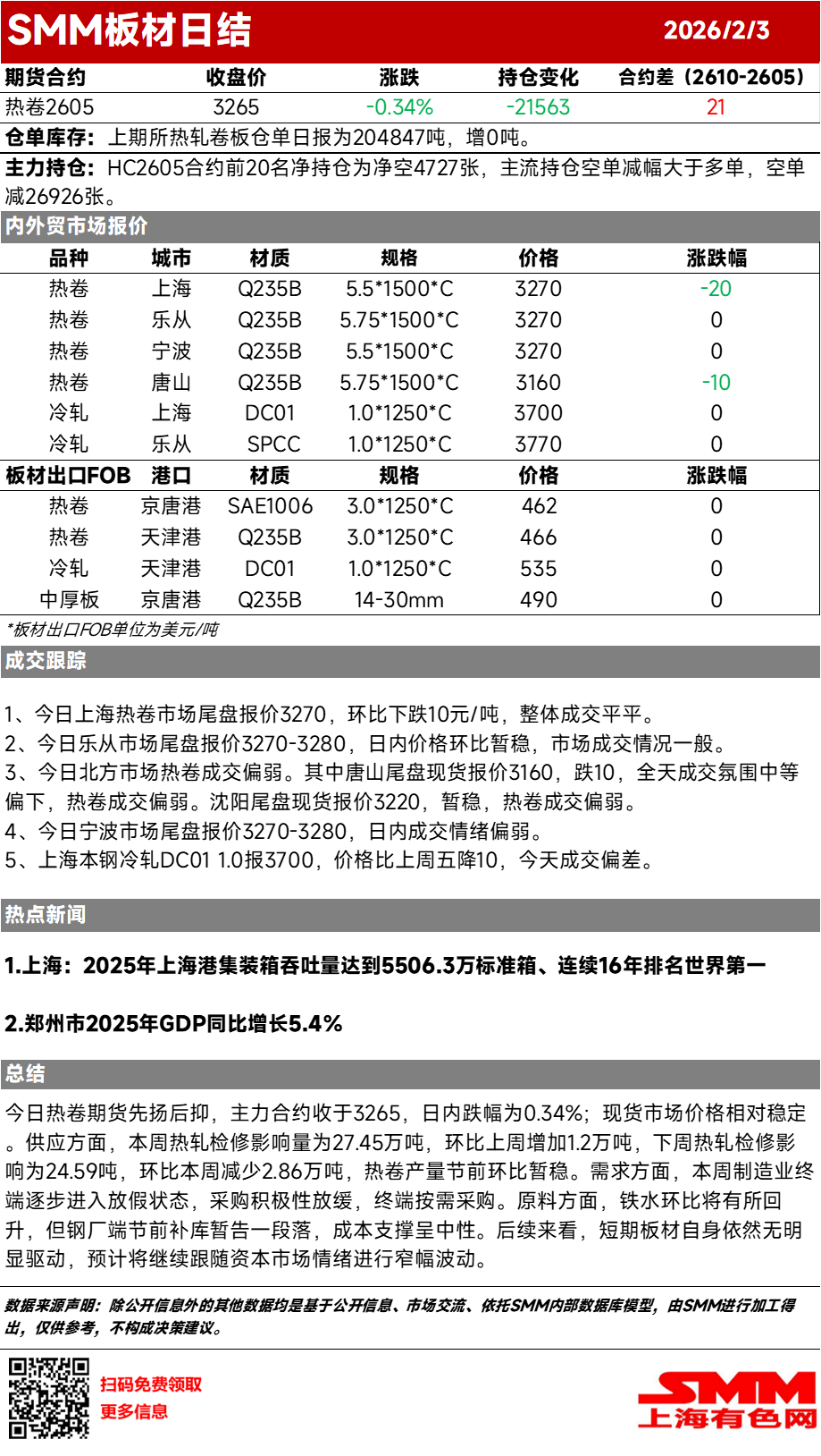 HRC futures rose first and then fell today, with the most-traded contract closing at 3,265, down 0.34% intraday; spot market prices remained relatively stable. Supply side, this week's HRC maintenance impact stood at 274,500 mt, up 12,000 mt WoW, while next week's HRC maintenance impact is expected to be 24.59 mt, down 28,600 mt WoW; HRC production remained stable WoW ahead of the holiday. Demand side, manufacturing end-users gradually entered the holiday period this week, with purchasing enthusiasm slowing down and end-users purchasing as needed. Raw material side, hot metal output is expected to rebound MoM, but pre-holiday restocking by steel mills has temporarily concluded, leaving cost support neutral. Looking ahead, sheets & plates lack clear short-term drivers and are expected to continue fluctuating rangebound following capital market sentiment.