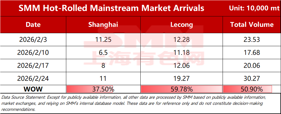 [SMM Hot-Rolled Steel Arrivals] Holiday Period Sees Significant Increase in Arrivals at Mainstream Markets