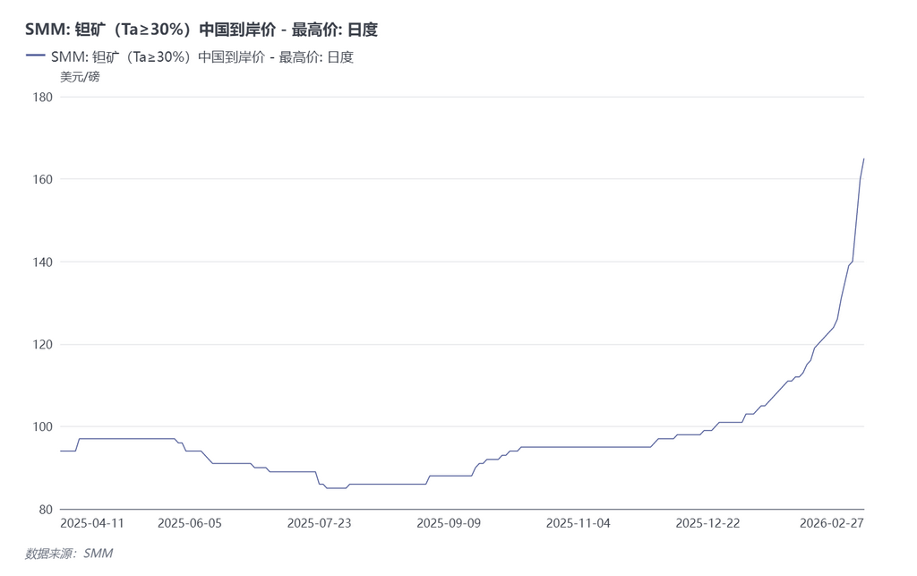 Tantalum ore prices have experienced a substantial increase, with the CIF China price quoted at $160–165 per pound, up 17.32% from pre-holiday quotes. This rise is primarily driven by two factors. On one hand, landslides and production halts at core mining areas have directly led to a tangible contraction in global supply, rapidly tightening the availability of spot cargo. On the other hand, downstream electronics manufacturers and traders, driven by bullish sentiment, have engaged in concentrated stockpiling and price locking, further exacerbating the supply-demand mismatch in the circulation chain and collectively pushing up transaction prices for ore.
