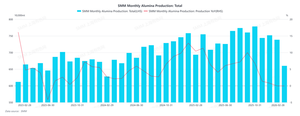 In February 2026, China's metallurgical-grade alumina output decreased by 10.6% month-on-month and also fell by 4.83% year-on-year. By the end of February, the national installed capacity stood at approximately 110.32 million mt, while operating capacity decreased by 1.06% month-on-month and 4.83% year-on-year, indicating a continued downward trend for the industry.