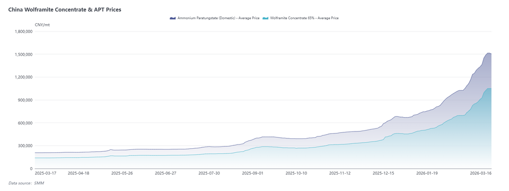 Nesta semana, tanto os preços do lado das matérias-primas quanto os do tungstênio reciclado no mercado chinês de tungstênio registraram uma leve correção, principalmente porque o receio diante dos preços elevados foi gradualmente dissipado. Desde o início de 2026, os preços do APT haviam subido mais de 100% de forma acumulada, e o entusiasmo do mercado estava um pouco esgotado. Recentemente, algumas minas registraram leilões sem sucesso, esfriando ainda mais o sentimento superaquecido, enquanto vendas localizadas pressionaram os preços a se consolidarem em torno de 1,5 milhão de yuans/mt.