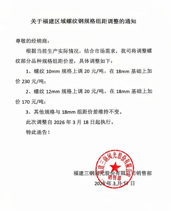 Based on current production conditions and in conjunction with prevailing market demand, mainstream steel mills in Fujian (such as Sansteel MinGuang, Fujian Sanbao, Fujian Dadonghai, Wuhang, and Fujian Hongfeng) successively adjusted the price spreads for specification components of construction steel starting March 17.