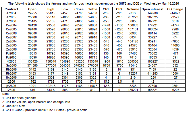 The following table shows the ferrous and nonferrous metals movement on the SHFE and DCE on 18 Mar , 2026