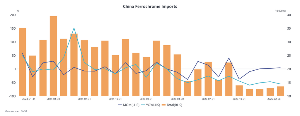 In February 2026, China’s total imports of high-carbon ferrochrome amounted to 135,600 metric tons, rising 4.7% month-on-month and dropping 55.5% year-on-year. Imports from South Africa were 40,400 metric tons, and imports from Kazakhstan were 88,600 metric tons, down 17.7% month-on-month.