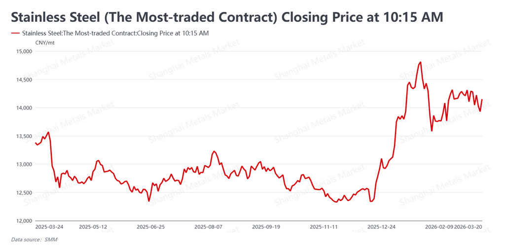According to SMM data, during the second half of the traditional "Golden March" peak consumption season (March 16 - March 20, 2026), the most-traded stainless steel futures contract (SS2605) trended lower from its highs under the dual pressure of macroeconomic headwinds and tepid actual demand. By the close on March 20, the contract retreated to 14,150 yuan/mt (approx. $2,051/mt), down 125 yuan/mt (approx. $18/mt) from last Friday's close of 14,275 yuan/mt (approx. $2,069/mt). The market's core feature this week was the marginal weakening of previous bullish factors: international macro signals tilted hawkish, raw material upward momentum stalled, and the substantive recovery of end-user demand during the peak season remained lackluster, prompting a rational pullback in futures prices after hitting resistance.