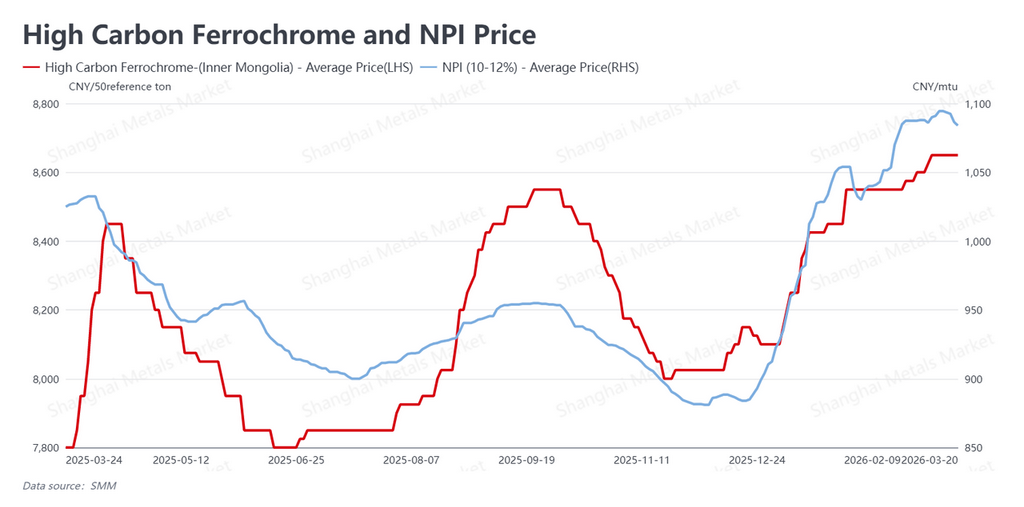 The cost side also showed signs of loosening from its highs. As of March 20, high-grade nickel pig iron (NPI) quotes ended their previous unilateral rally, edging down to 1,084 yuan/mtu (approx. $157/mtu), while high-carbon ferrochrome prices held steady at 8,650 yuan/50 mt (approx. $1,254/50 mt).