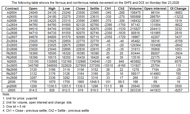 The following table shows the ferrous and nonferrous metals movement on the SHFE and DCE on 23 Mar , 2026