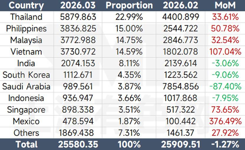 By country, in March, copper wire rod was mainly exported to Thailand, the Philippines, Malaysia, Vietnam, and India, with combined exports accounting for over 70% of the national total. Notably, Saudi Arabia's ranking pulled back sharply from first to seventh place, with exports plunging 87.4% MoM. This was mainly due to the continued geopolitical tensions in the Middle East, which weakened domestic demand in Saudi Arabia and slowed down the procurement pace in infrastructure, power grid, and other sectors. Compounded by disruptions in regional shipping, logistics, and customs clearance, trade flows were hampered, leading to a decline in exports.