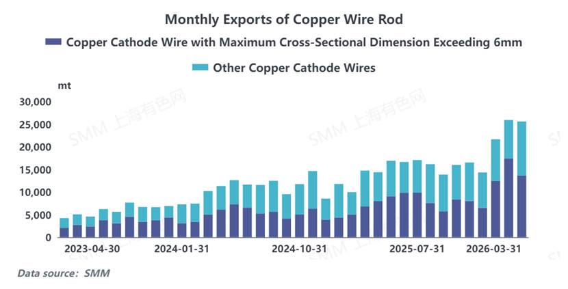 According to customs data, in terms of total copper cathode wire rod exports, total exports of copper cathode wire rod (HS code 74081100, 74081900) in March were down 1.27% MoM but up 73.71% YoY. Among them, exports of refined copper wire with a maximum cross-section dimension >6mm were 13,600 mt, down 21.73% MoM but up 100.86% YoY. Exports of other refined copper wire were 11,900 mt per month, up 40.79% MoM and up 50.47% YoY.